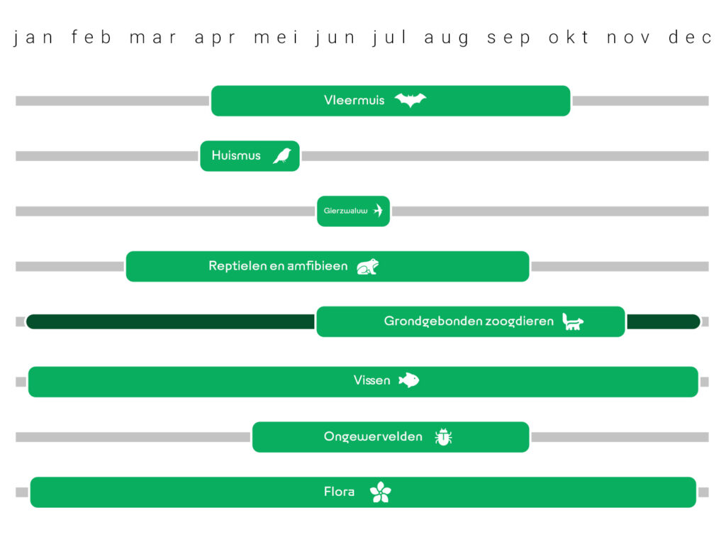 Dit hangt van de soort af. Maar voor verreweg de meeste soorten is er soortspecifiek onderzoek nodig om vast te stellen of de Wet met de geplande werkzaamheden overtreden gaat worden. Voor sommige soorten, zoals kleine marterachtigen, kan soms al direct met de ontheffingsaanvraag gestart worden zonder eerst aan- of afwezigheid aan te tonen.