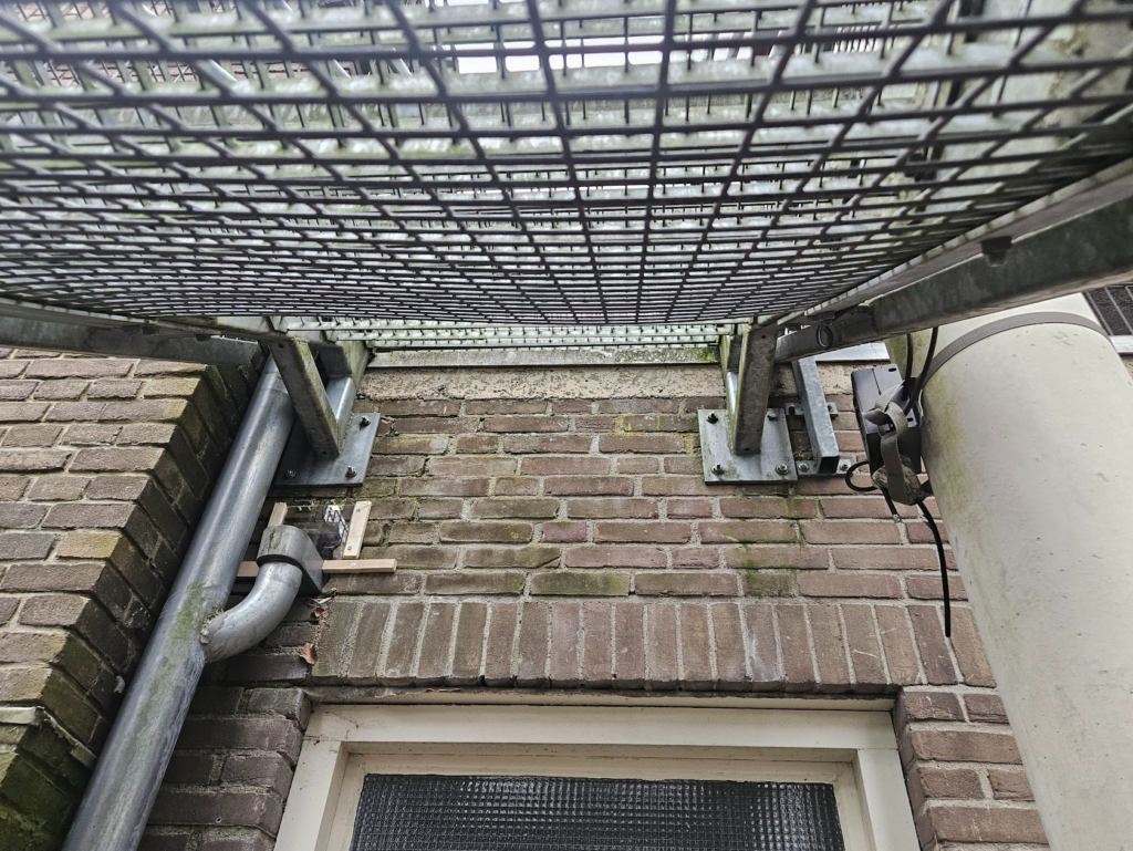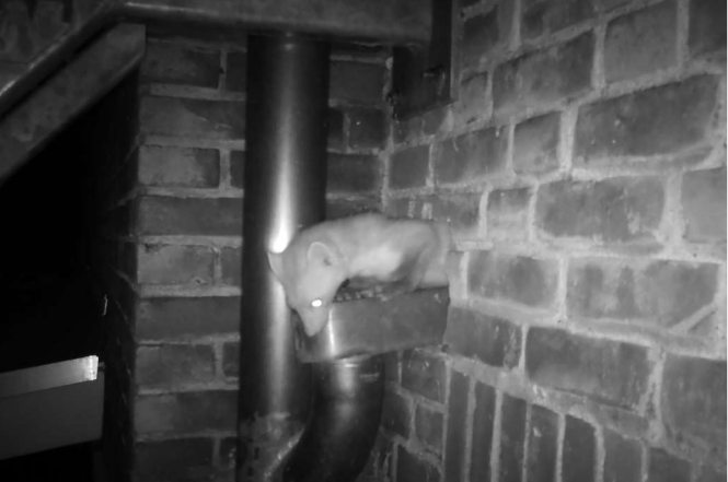 De opening bevindt zich boven de regenpijp en daarom is hier een camera op gericht. Door middel van een 1-weg klep kan de steenmarter alleen nog naar buiten en dus niet meer naar binnen.